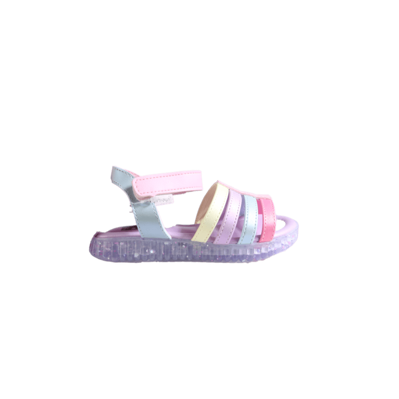 O solado translúcido com glitter é feito com borracha antiderrapante e tecnologia TR Eco, que leva 20% de matérias-primas renováveis. A palmilha anatômica oferece conforto a cada passo, enquanto o fecho em fita aderente torna o calce fácil, incentivando a autonomia das meninas.