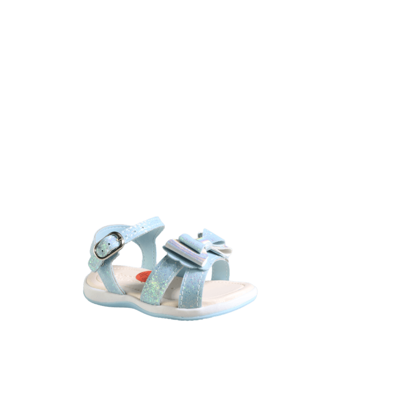 Cor: A sandália tem um tom suave de azul-claro, com um acabamento em glitter que cobre todo o material, conferindo um visual mágico e delicado.